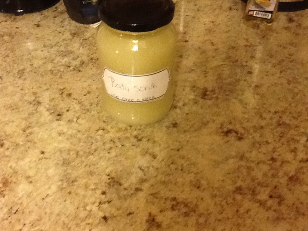 After making this scrub, I had to try It. I love the way it felt on my skin. I shook the jar and scooped some out and used it. It made my skin soft so there was no need for lotion. You want to pat your skin dry so you don't take off the oil that is in the scrub.
